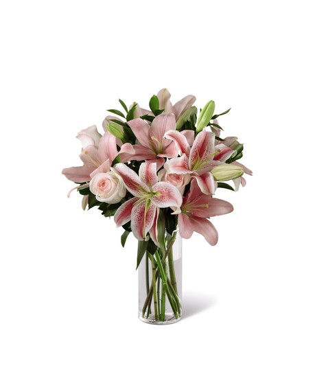 Like a lovely floral hug, this blushing bouquet delivers your sincerest condolences in a way that s sure to comfort the pain of loss. Simple and beautiful, this composition handcrafted by an FTD artisan florist of pink roses and pink Asiatic lilies enhanced with lush greens is arranged in a clear glass cylinder vase. It makes an excellent choice for expressing your sympathy at a wake, for the funeral service or to console family and friends at home.