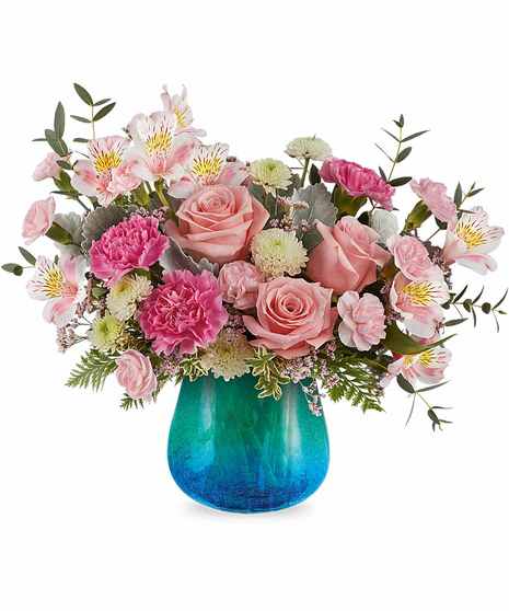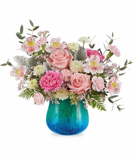 The Blue Hues Bouquet features pink roses, pink alstroemeria, pink carnations, miniature pink carnations, white button spray chrysanthemums, pink limonium, dusty miller, parvifolia eucalyptus, leatherleaf fern, and oregonia, presented in our Blue Hues Vase, a translucent glass vase with a turquoise gradient and crackled design.