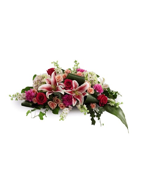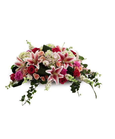 An extraordinary way to pay your respects to someone very close, this colorful mixed flower casket spray beautifully delivers your sincere expression of love and sympathy. Traditionally ordered by the deceased s immediate family, this casket enhancement handcrafted by a local FTD artisan florist, includes larkspur, roses, carnations, hydrangeas and Stargazer lilies complemented with lush greens including aspidistra, salal and ivy vines. It s made to fit over the closed portion of a casket cover during visitation at a funeral home, at a funeral service and at a graveside ceremony at the cemetery.