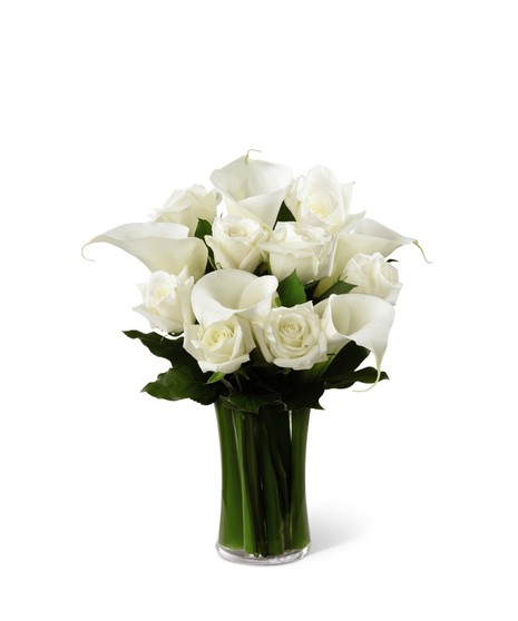 The FTD® Sweet Solace™ Bouquet is a divinely elegant arrangement that encourages peace and offers your sympathy. Brilliant white roses and calla lilies are simply set amongst lush greens in a clear glass gathering vase to create a meaningful gift that will help your special recipient through this trying time of grief and loss.