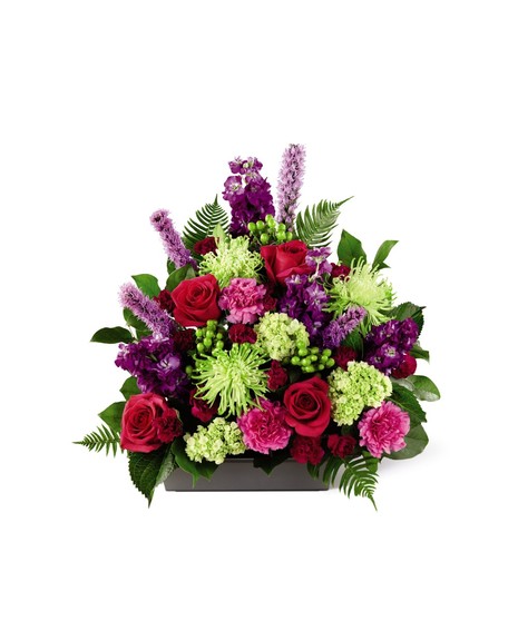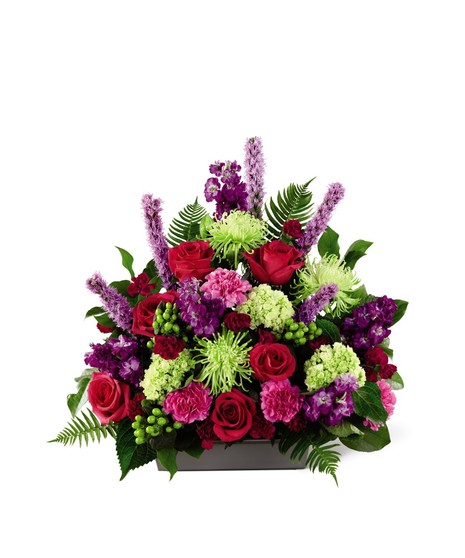 A lovely way to say, farewell, this bright, beautiful arrangement expresses your sympathy with color, texture and floral artistry, while comforting grieving friends and family. This handcrafted bouquet is handcrafted by a local FTD florist and makes a vibrant statement with hot pink roses, pink and fuchsia carnations, purple stock, green spider chrysanthemums, mini-hydrangea and hypericum berries all accented with sword fern and salal in a low rectangle container of silvery metallic plastic.