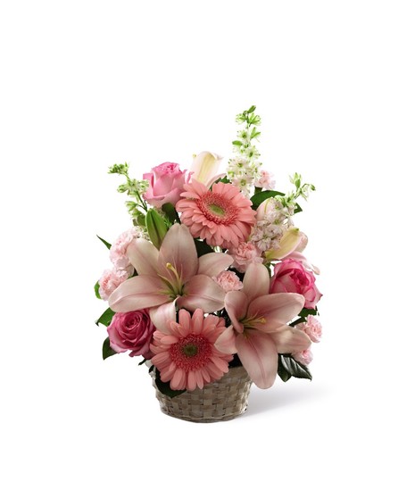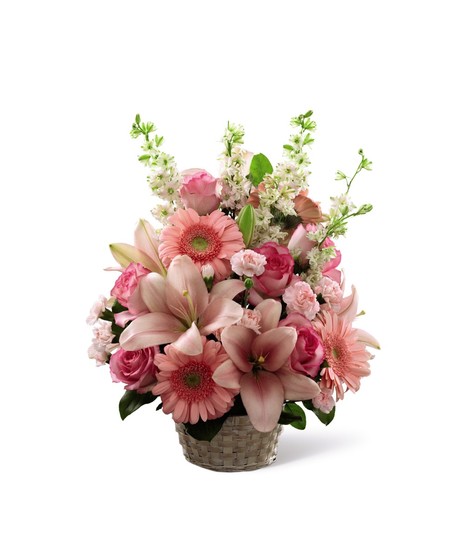 This fresh, pink bouquet makes a perfect tribute to honor a special someone who, friends, colleagues and family remember as simply sweet. This understated tribute handcrafted by an FTD artisan florist is a lovely pink arrangement of roses, larkspur, carnations, gerbera daisies and Asiatic lilies beautifully accented with vibrant greens in a white basket. It brings a touch of color and beauty for a wake, funeral service or to console family or friends at home.