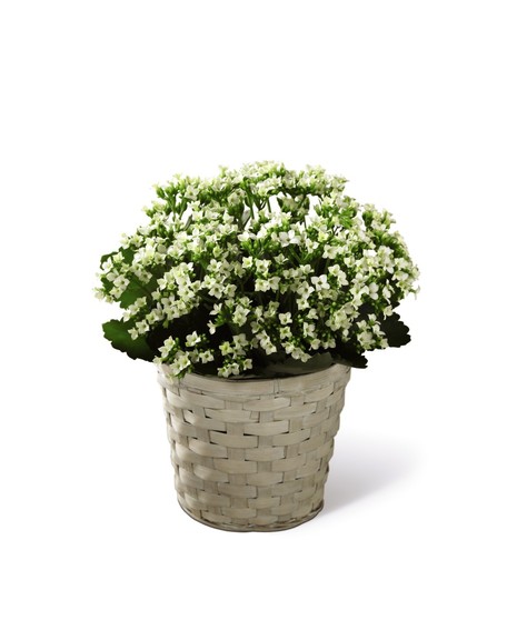Loving expressions of comfort and consolation flourish beautifully with this blooming Kalanchoe plant. Covered in a canopy of tiny white blooms, this full and flowery herbaceous plant sends an understated expression of heavenly hope, so appropriate and so meaningful at a time of sorrow and loss. It makes a beautiful addition to a wake or funeral service, and would be a welcomed gift when sent to the home of grieving friends and family so they know you are thinking of them. Its simple, lovely whitewashed basketweave pot cover complements any home or office d cor.