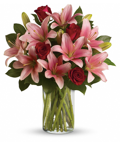 Turn an ordinary day into an enchanting daydream by sending her this magical bouquet! This stunning bouquet of rich red roses and magnificent pink lilies pampers her senses, refreshes her spirit and shows her how much you really care.